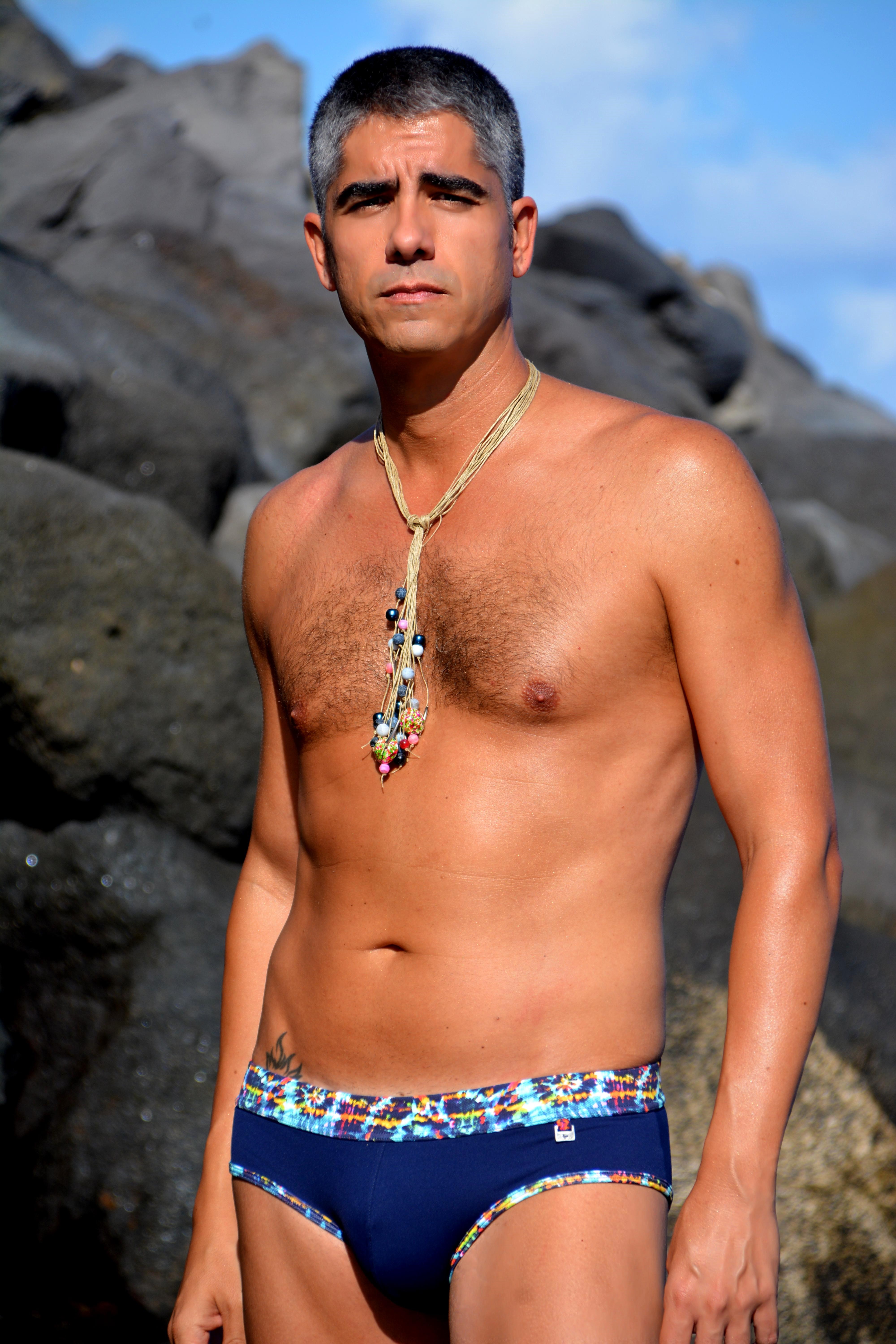 Richard: lleva slip Dog Island con coquina extraíble y cinturilla en contraste de color. Collar tipo corbata de cordón y cuentas de colores.