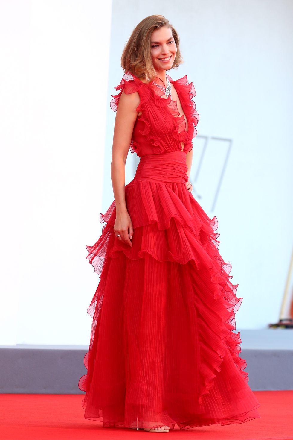Y que me dicen del vestido vintage que llevó en la alfombra roja, un Alberta Ferretti en degradado en rojos, que decidió completar con joyas de Bulgari en tonos azules, contrastando con el vestido. Una reina en Venecia, pisando fuerte y dejando elegancia por donde va.