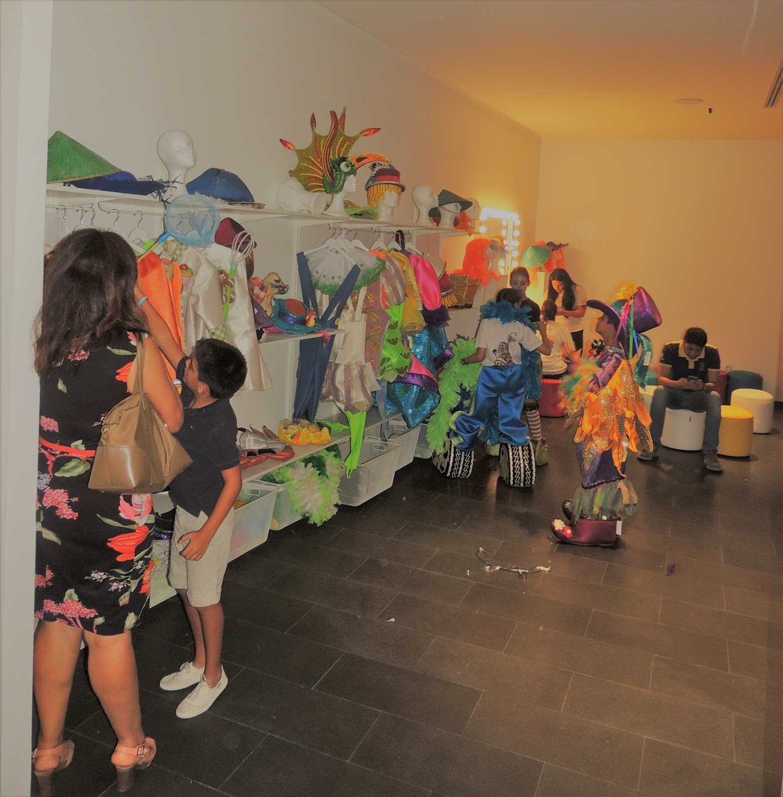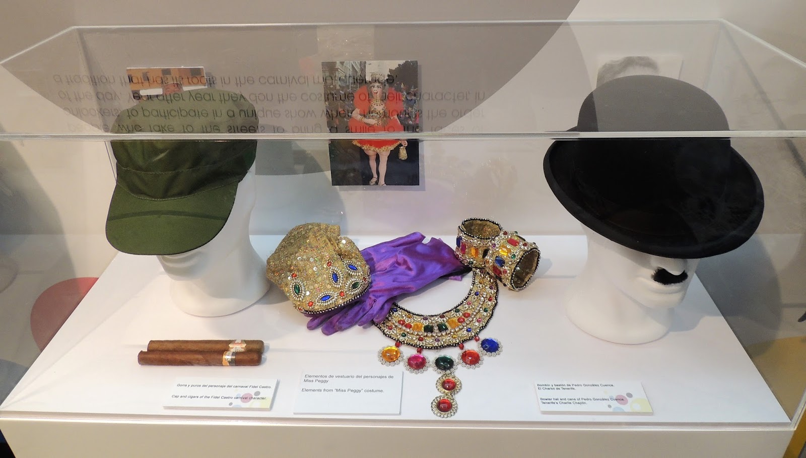 Y en la sala grande, a la derecha según entras al edificio, se encuentra una gran vitrina que ocupa casi todo el largo donde están expuestos trajes de distintas agrupaciones: murgas adultas e infantiles, comparsas, agrupaciones musicales y rondallas.