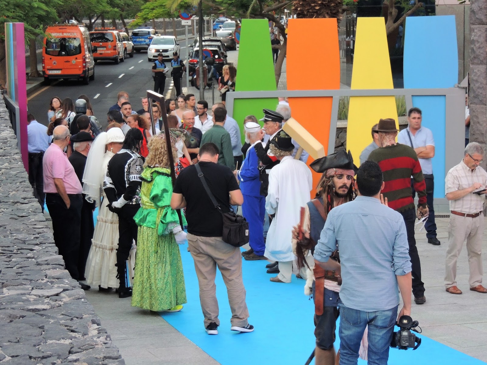 El acto comenzaba a partir de las 21:00 horas, los invitados fueron llegando poco a poco. Los había de todos los ámbitos: representantes de las agrupaciones del carnaval, diseñadores, periodistas, políticos, reinas del carnaval, todas personas vinculadas a este mundo. Al lugar accedíamos franqueando una puerta muy colorida, decorada con gigantes pitos de murga, y eramos recibidos por los personajes del carnaval, que aprovechaban para bromear y hacer de las suyas.