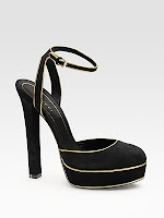 Como ven en la foto, este zapato carece de tacón. Lleva plataforma, va abrochado al tobillo mediante una correa y es abierto en su parte delantera.